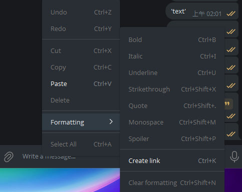 Telegram 提供了一个便捷的格式面板,用户无需记住任何特定语法即可应用样式。在桌面版本中,您可以通过突出显示要设置格式的文本来访问此功能;所选文本上方会出现一个工具栏,其中包含粗体、斜体等选项。对于 Android 和 iOS 移动用户,只需点击并按住文本,直到出现选择手柄,然后从上下文菜单中选择“格式”即可