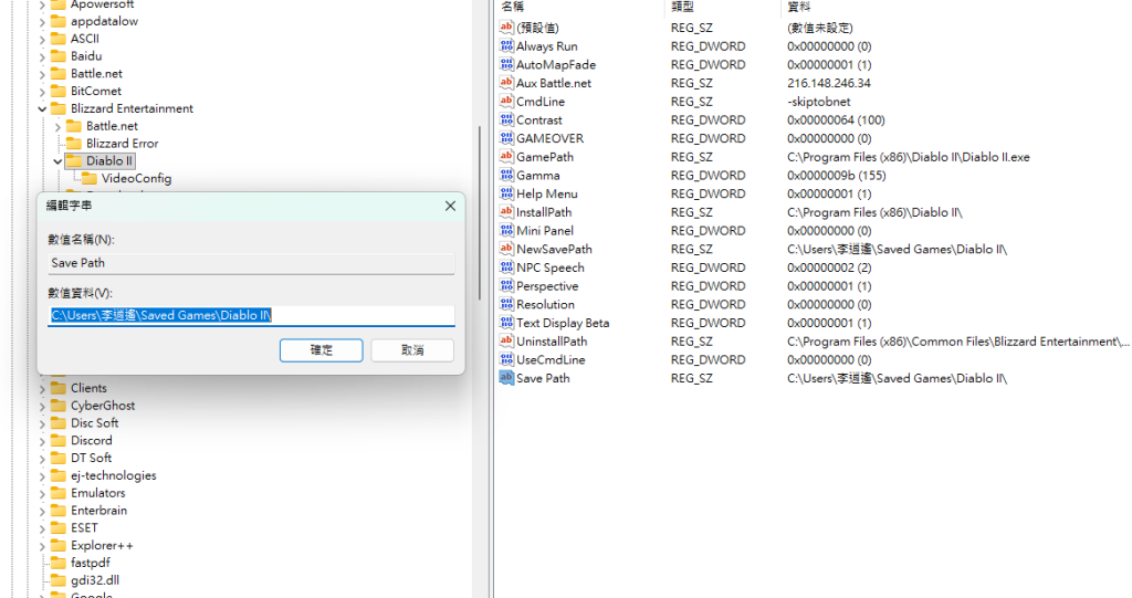 然后新增一个字串,命名为「Save Path」,将人物存储路径输入到值里面然后保存,记得路径最后面还要再加上一个斜线,C:\Users\<你的使用者名稱>\Saved Games\Diablo II\